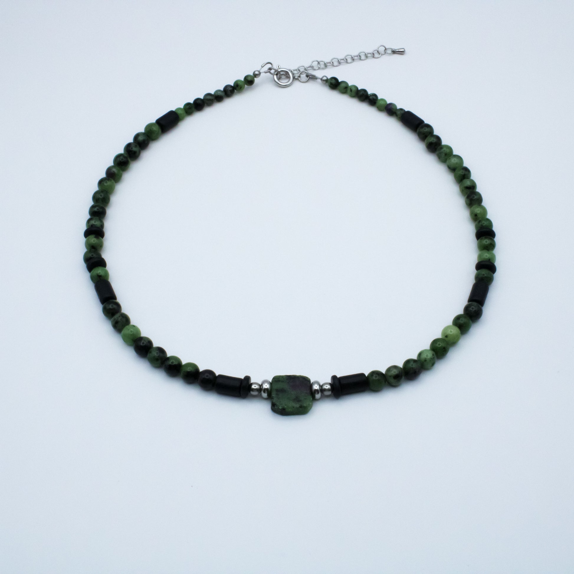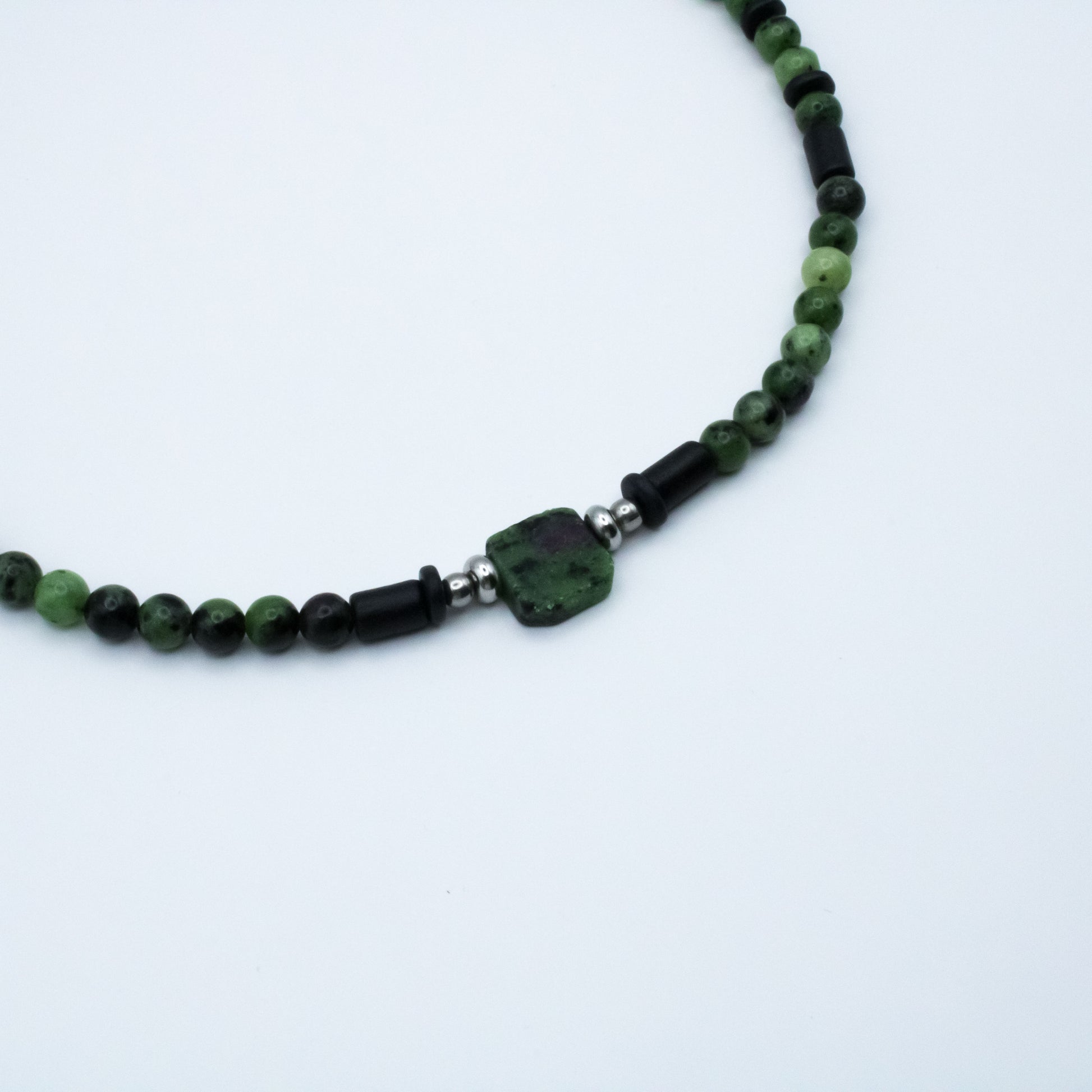 Pour cette collection, je me suis naturellement tournée vers le rubis zoïsite, jolie pierre verte délicatement parsemée de noir et de rose. Pierre d’équilibre, de vitalité, de force et de motivation.